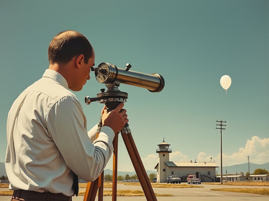 I used this prompt: Generate a vintage Rembrandt-style painting of my then 25-year-old Dad as a weatherman at the local Sacramento Municipal airport, using a manual scope theodolite to track a tiny plain white weather balloon in the upper right of the frame. The scope is pointed at the balloon. The balloon has no string. It takes place in the ’60s. The scope is pointed upward at the disappearing white balloon. Dad is to the left, peering into the scope lens. He was a weatherman. He wears a white shirt and tie and faces the “camera.” The scene is in a small airport setting with the tower nearby. Dad had receding hair even at the age of 25.