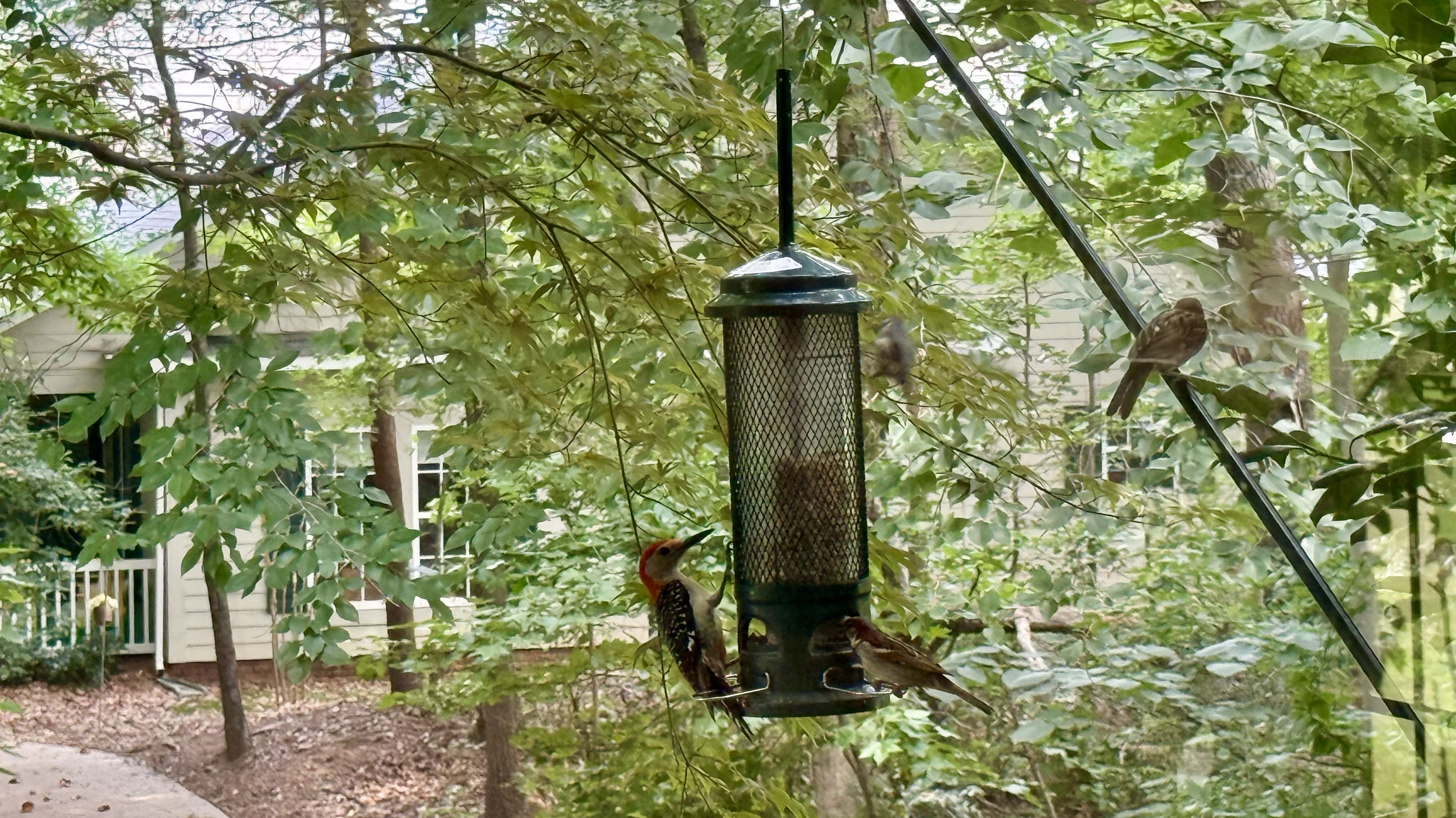 June in North Carolina paints a vibrant view from the front porch, where lush trees and shrubs surround a hanging tube feeder filled with seeds. A tufted titmouse perches on top, its gray body and crest catching the light. Below, a red-bellied woodpecker clings to the mesh, its red head and striped back standing out boldly. A chipping sparrow balances on the tray, its brown streaks and rufous crown adding variety.