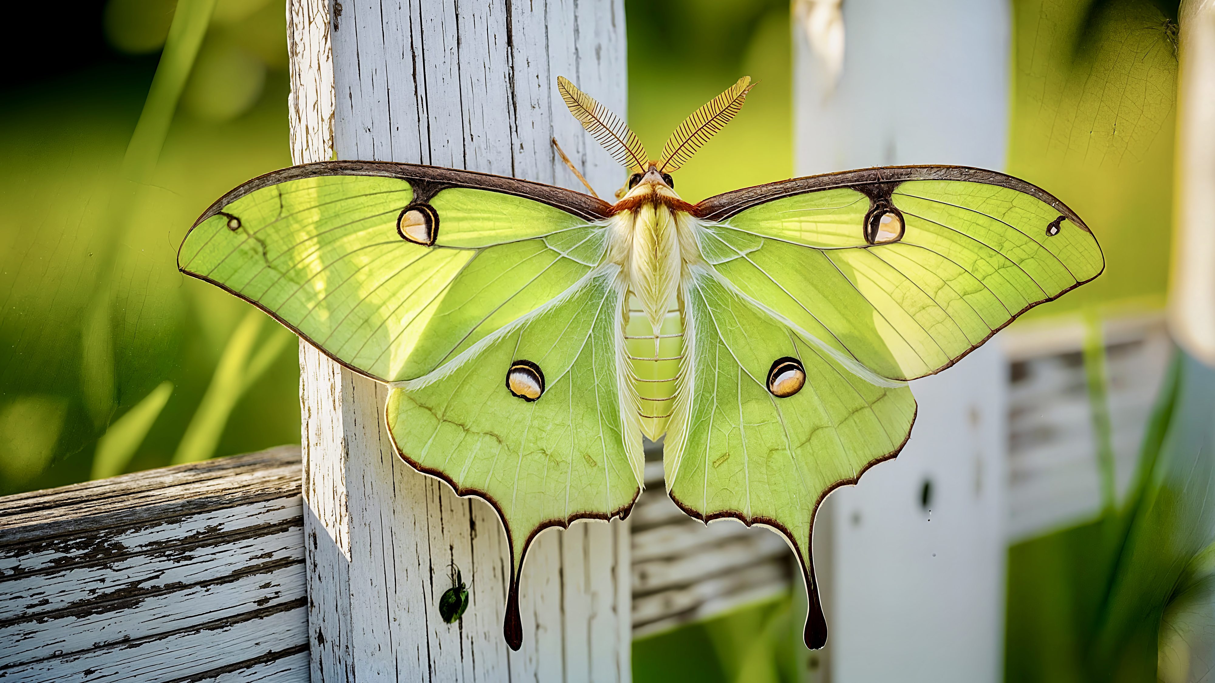 The luna moth, or American moon moth, is a large Nearctic moth from the Saturniidae family, known as giant silk moths. It has striking lime-green wings and a white body, with caterpillars that are also green. The moth’s wingspan typically measures about 114 mm but can reach up to 178 mm (7 inches), making it one of North America’s larger moths. In Canada, it produces one generation per year, with adults emerging in late May or early June. In southern regions of the United States, it can have two or three generations, with the first appearing as early as March. For defense, luna moth larvae emit warning clicks and regurgitate intestinal contents to deter predators, while the elongated tails on the moth’s hindwings may disrupt the echolocation of predatory bats. A parasitoid fly, introduced to control the invasive spongy moth, has negatively affected luna moths and other native moth species.